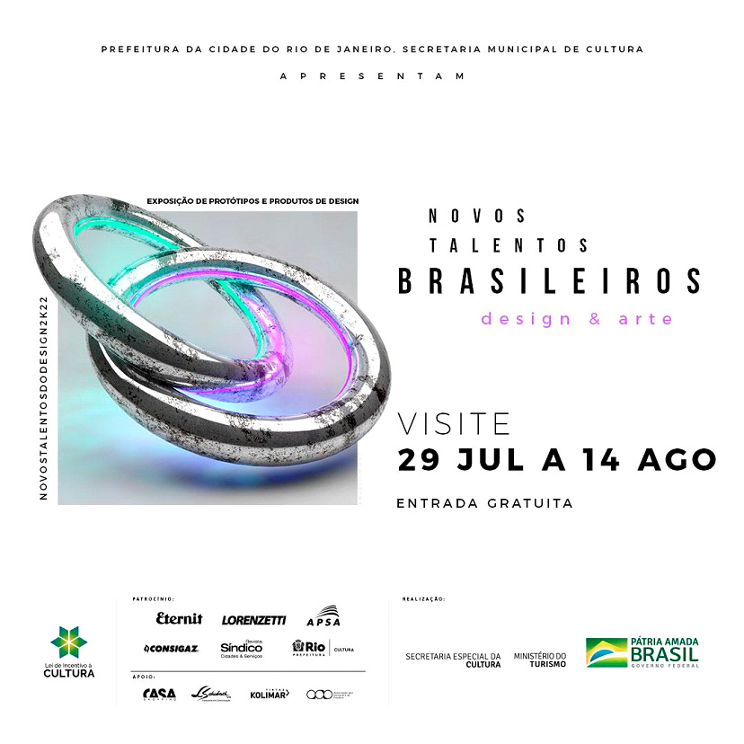 Voltada a revelar talentos do segmento, o projeto Novos Talentos Brasileiros – Design & Arte realiza sua 7ª edição entre os dias 29 de julho e 14 de agosto de 2022, com exposição no CasaShopping, no Rio de Janeiro, em uma área aberta de 300 metros quadrados.